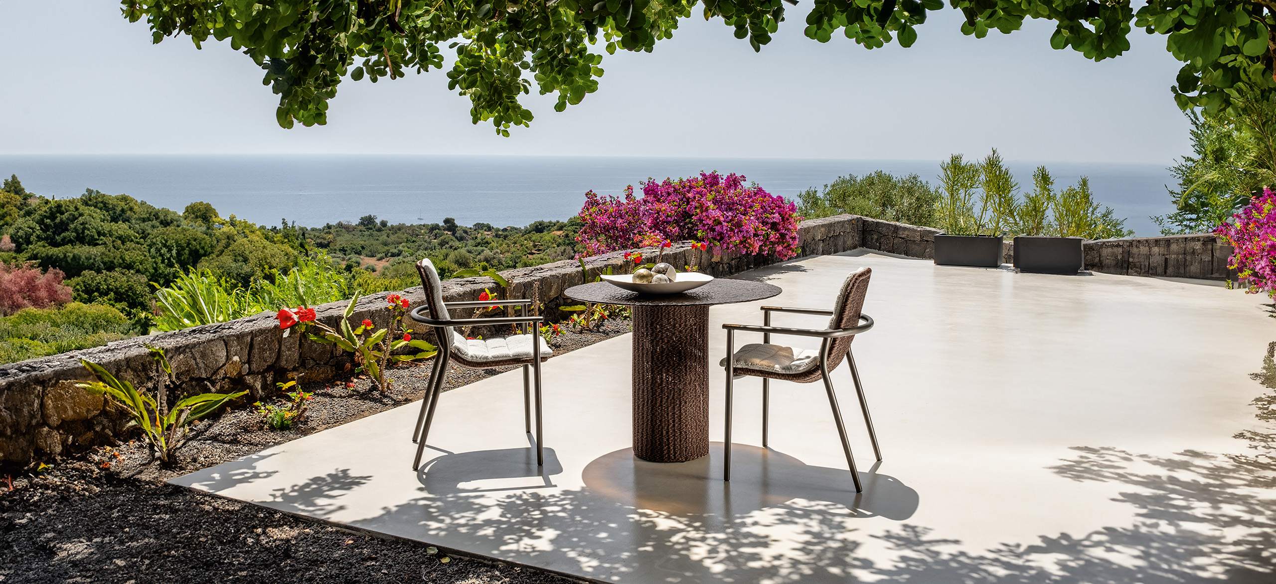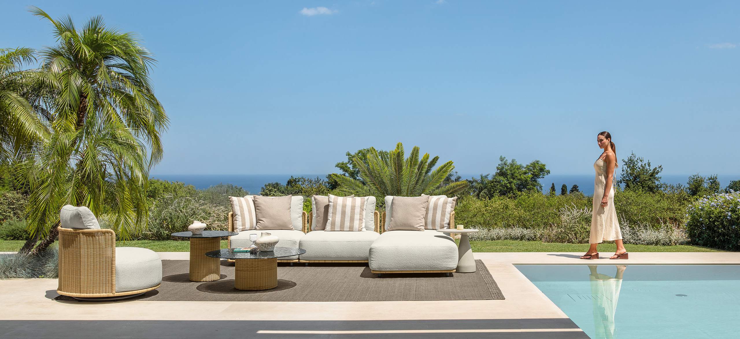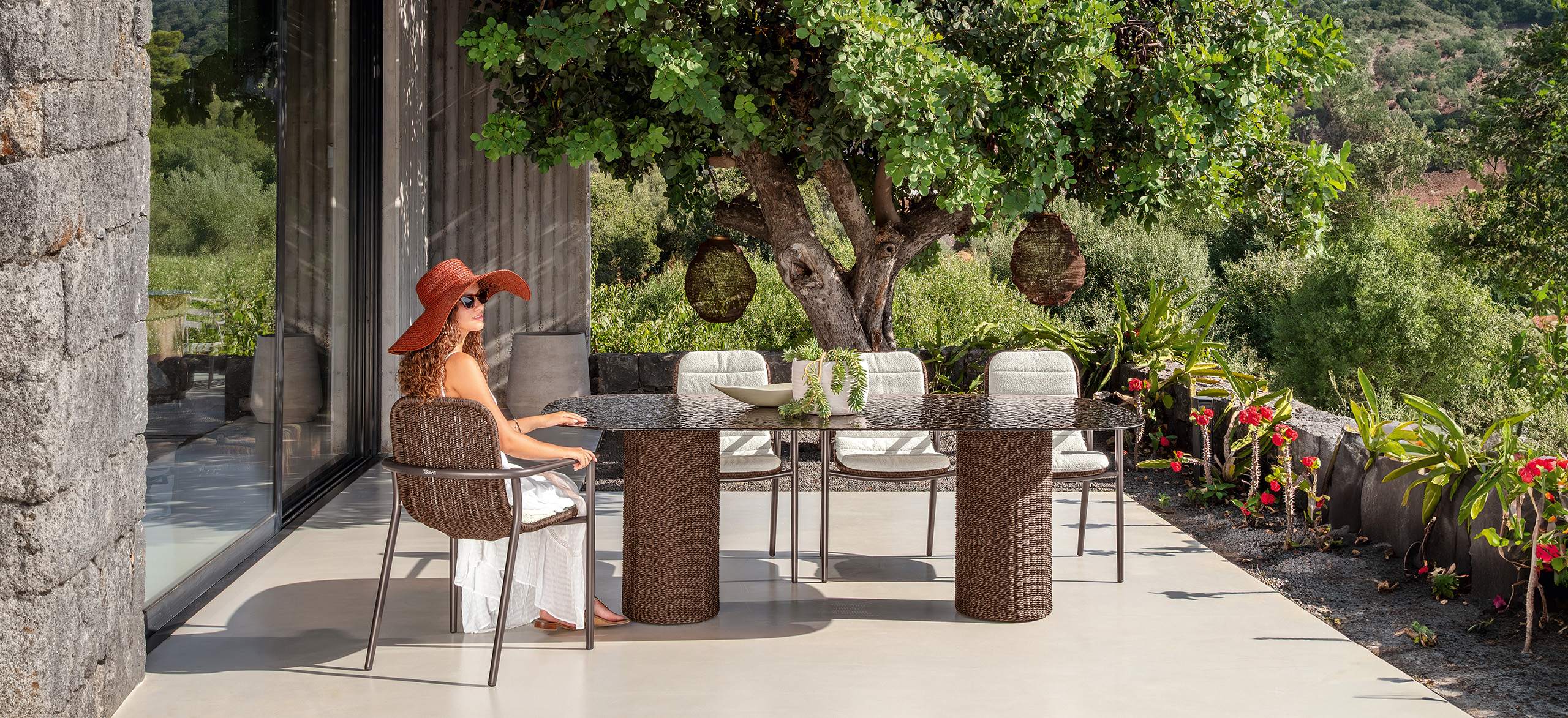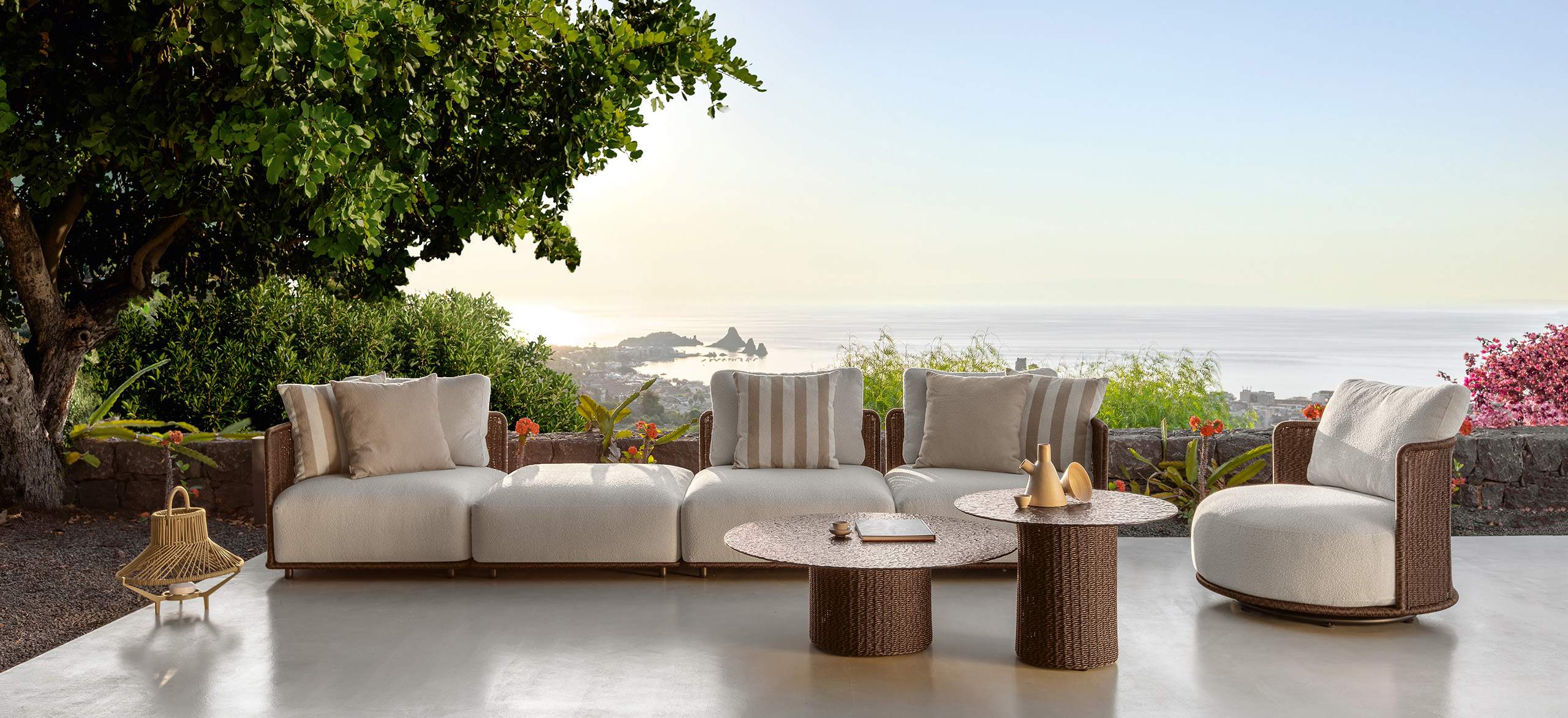 Bond s’inspire du concept d’union, de proximité, qui s’exprime précisément à travers l’assemblage des modules individuels. La forme arrondie des coussins d’assise souligne ce lien et joue avec les ombres créées par les volumes. Les assises, extrêmement généreuses mais compactes en profondeur, ont un fort impact et font du canapé un meuble d’un confort manifeste. La structure tubulaire en aluminium est recouverte de rotin et complète la dimension architecturale de l’objet. Le confort est en outre assuré par un généreux coussinage décoratif. La famille se complète de fauteuils pivotants de salon, lounge et dining qui reprennent le tressage du canapé, en teinte claire ou plus soutenue, délicatement portés par une structure en aluminium dont la forme varie de manière dynamique, créant un agréable mouvement et un sentiment de légèreté. Les plateaux des tables basses et de repas apportent de l’innovation parmi les matériaux de la gamme Talenti : reposant sur une ou plusieurs structures cylindriques, ils sont composés d’un verre texturé, aux nuances allant du café au gris fumé, évoquant les profils de la terre.