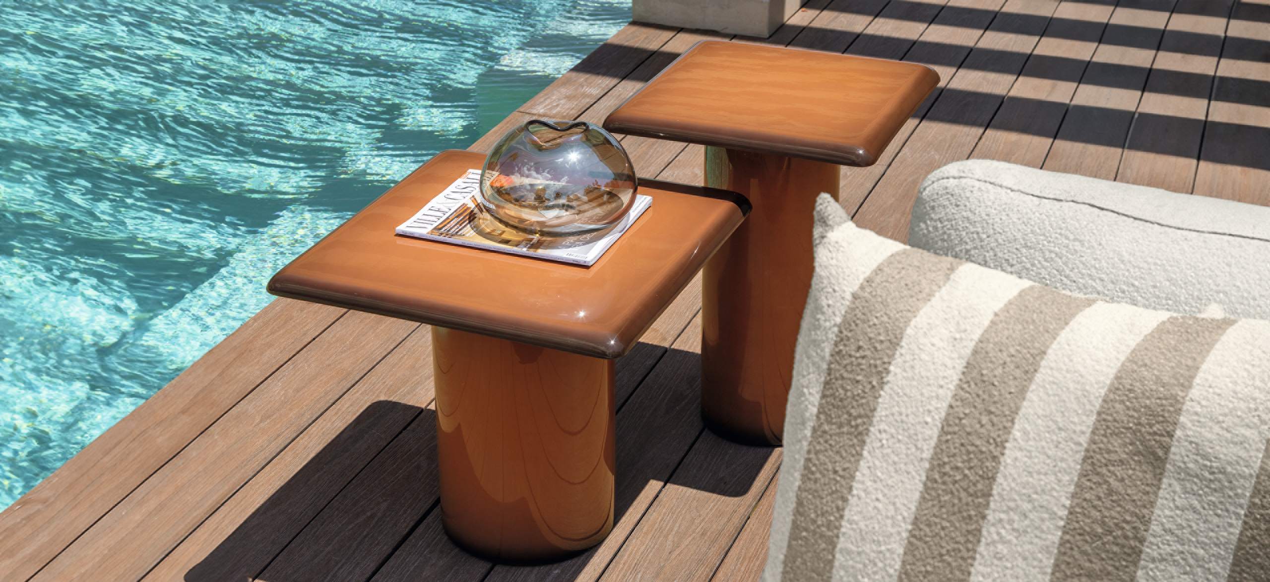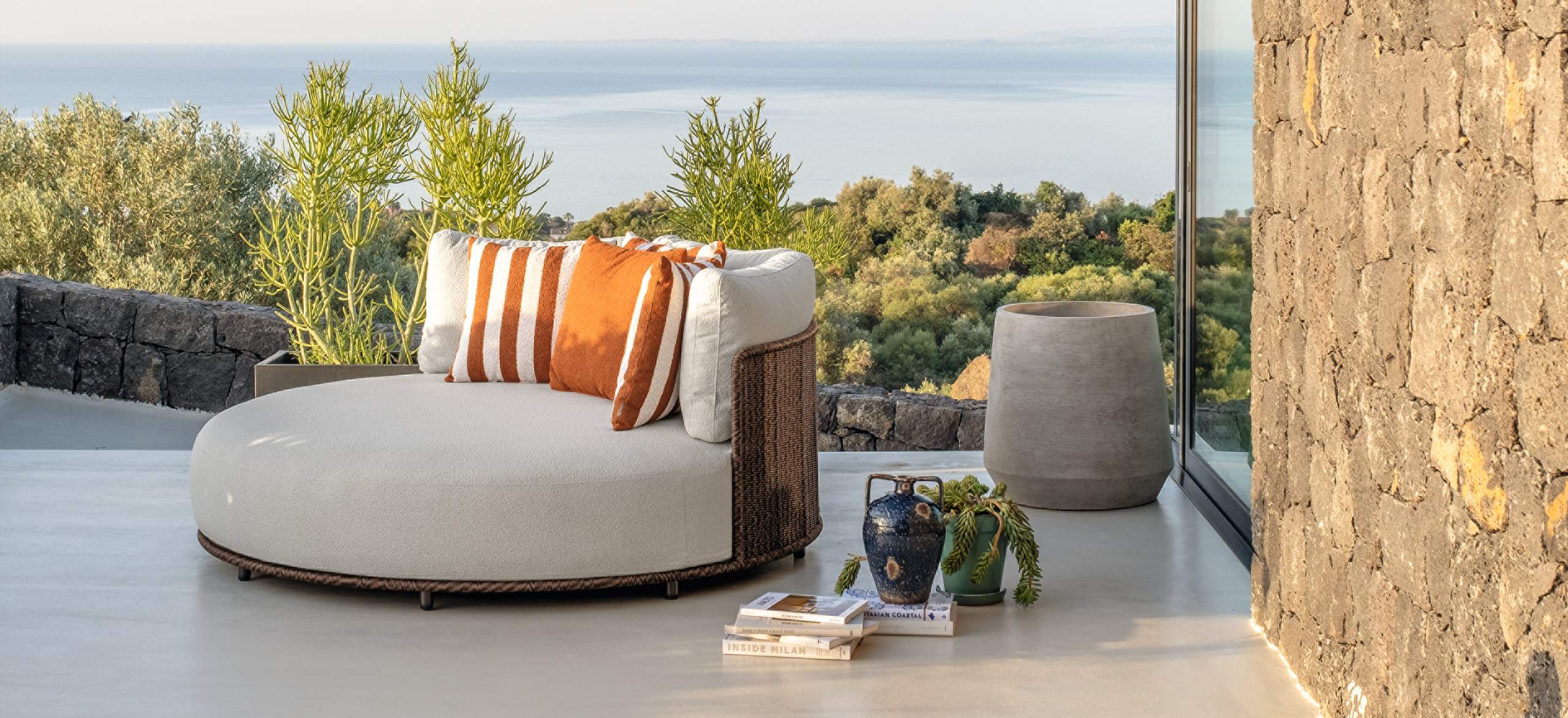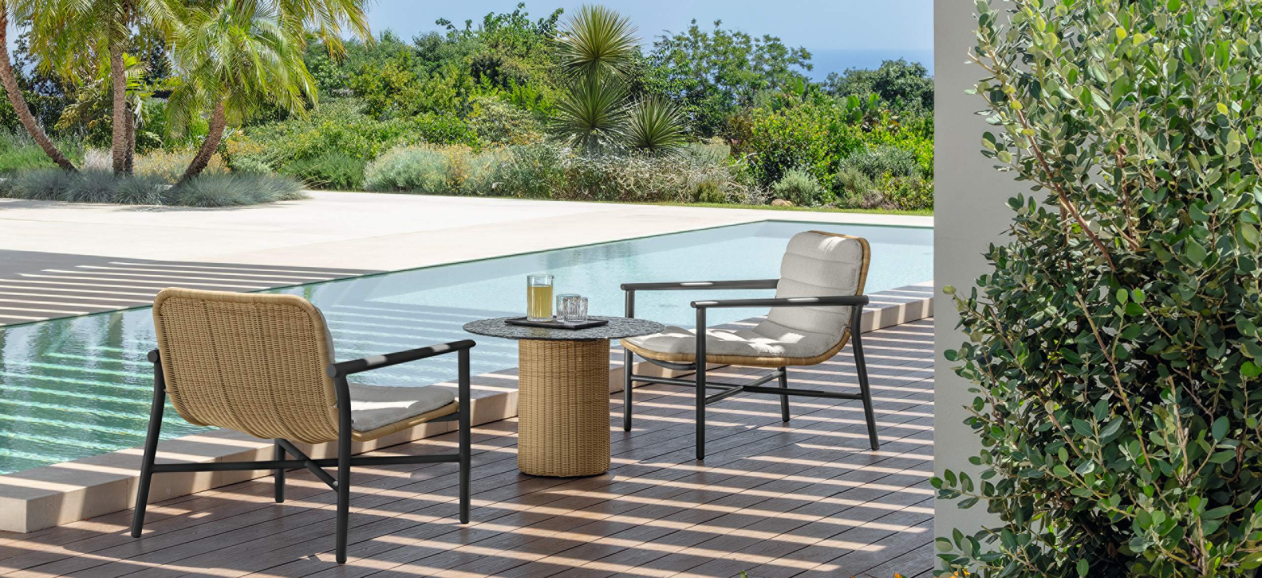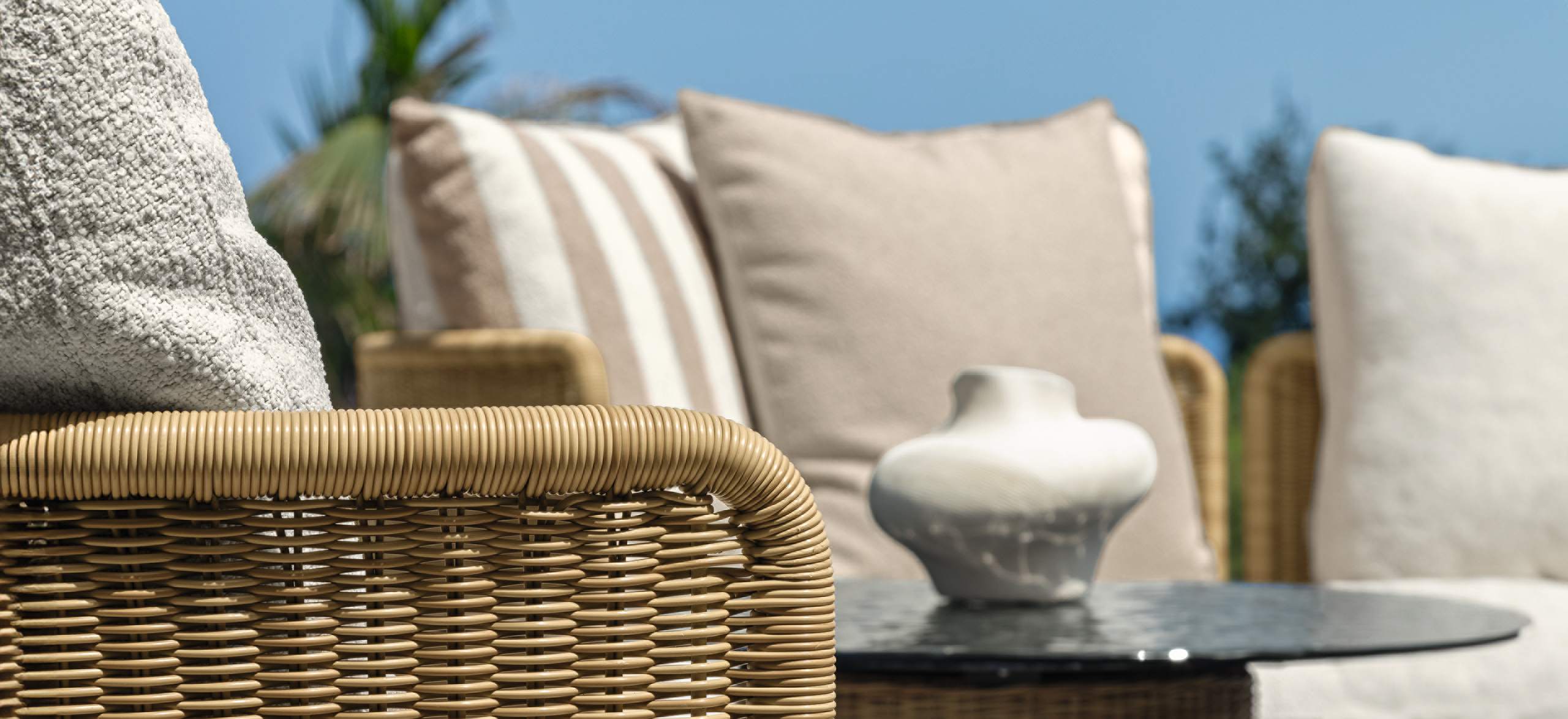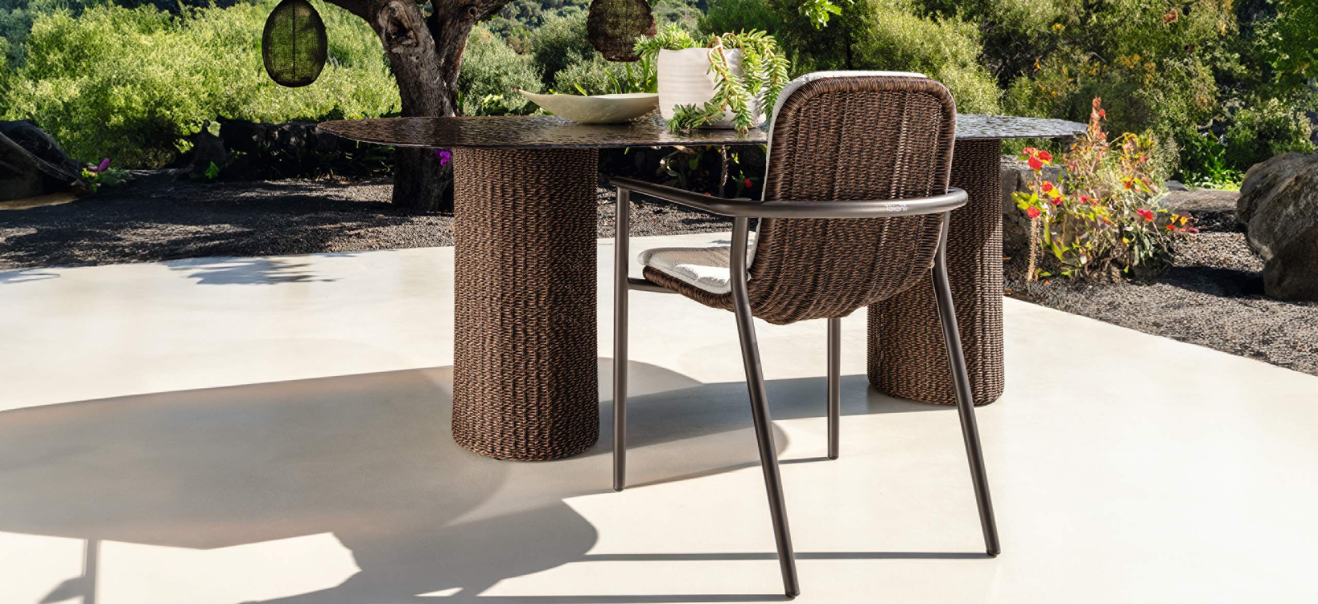 Bond s’inspire du concept d’union, de proximité, qui s’exprime précisément à travers l’assemblage des modules individuels. La forme arrondie des coussins d’assise souligne ce lien et joue avec les ombres créées par les volumes. Les assises, extrêmement généreuses mais compactes en profondeur, ont un fort impact et font du canapé un meuble d’un confort manifeste. La structure tubulaire en aluminium est recouverte de rotin et complète la dimension architecturale de l’objet. Le confort est en outre assuré par un généreux coussinage décoratif. La famille se complète de fauteuils pivotants de salon, lounge et dining qui reprennent le tressage du canapé, en teinte claire ou plus soutenue, délicatement portés par une structure en aluminium dont la forme varie de manière dynamique, créant un agréable mouvement et un sentiment de légèreté. Les plateaux des tables basses et de repas apportent de l’innovation parmi les matériaux de la gamme Talenti : reposant sur une ou plusieurs structures cylindriques, ils sont composés d’un verre texturé, aux nuances allant du café au gris fumé, évoquant les profils de la terre.