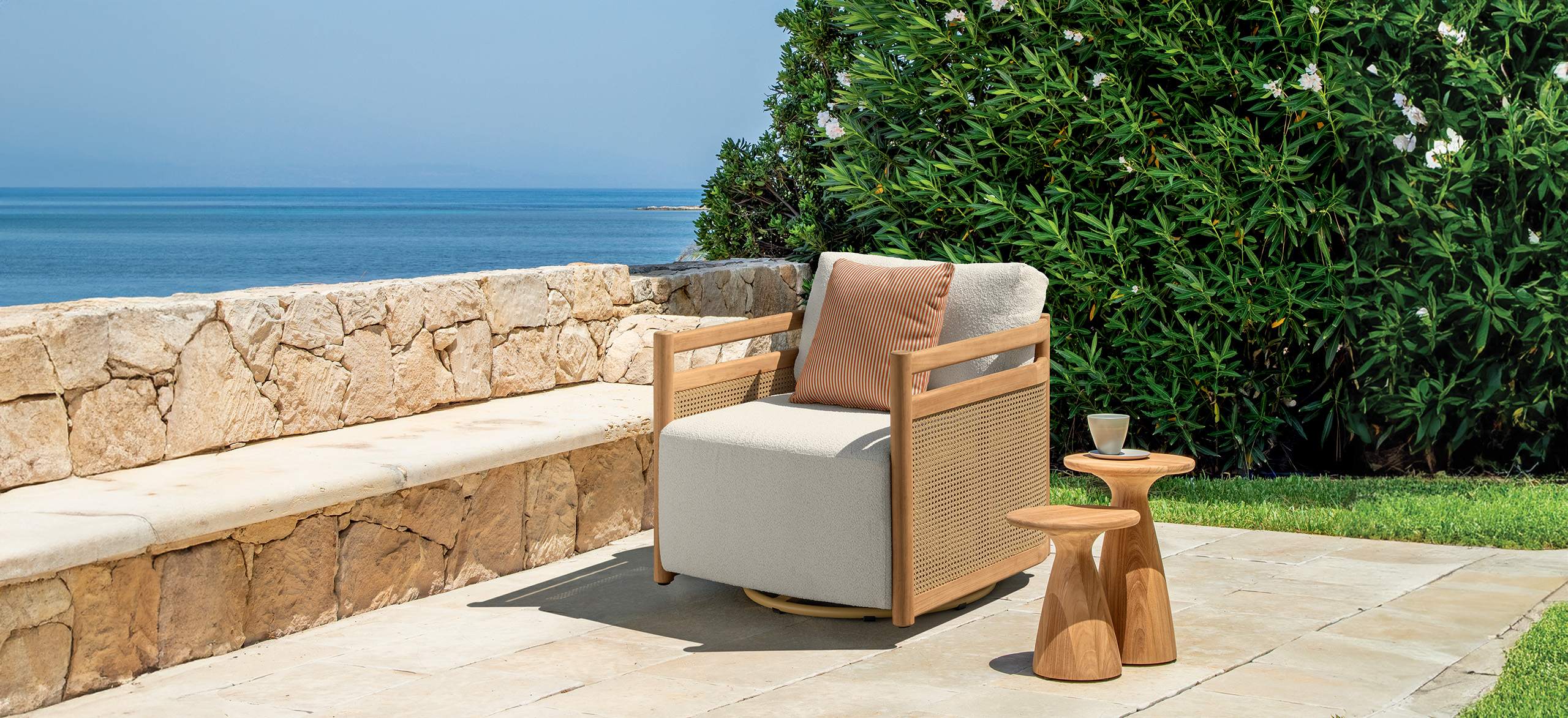 Edwin est une collection outdoor qui célèbre la beauté naturelle du bois, associée à des lignes épurées et à une structure robuste pour garantir durabilité et confort. Chaque pièce est conçue pour mettre en valeur les veines et les nuances uniques du teck, transformant les espaces extérieurs en environnements chaleureux et raffinés. L’équilibre entre tradition et modernité se reflète dans les formes essentielles, dans le choix du tissu bouclé et dans l’utilisation de l’élégant cannage de Vienne, devenu célèbre à l’époque victorienne et réinterprété au fil des siècles, donnant naissance à des pièces de design au charme intemporel.