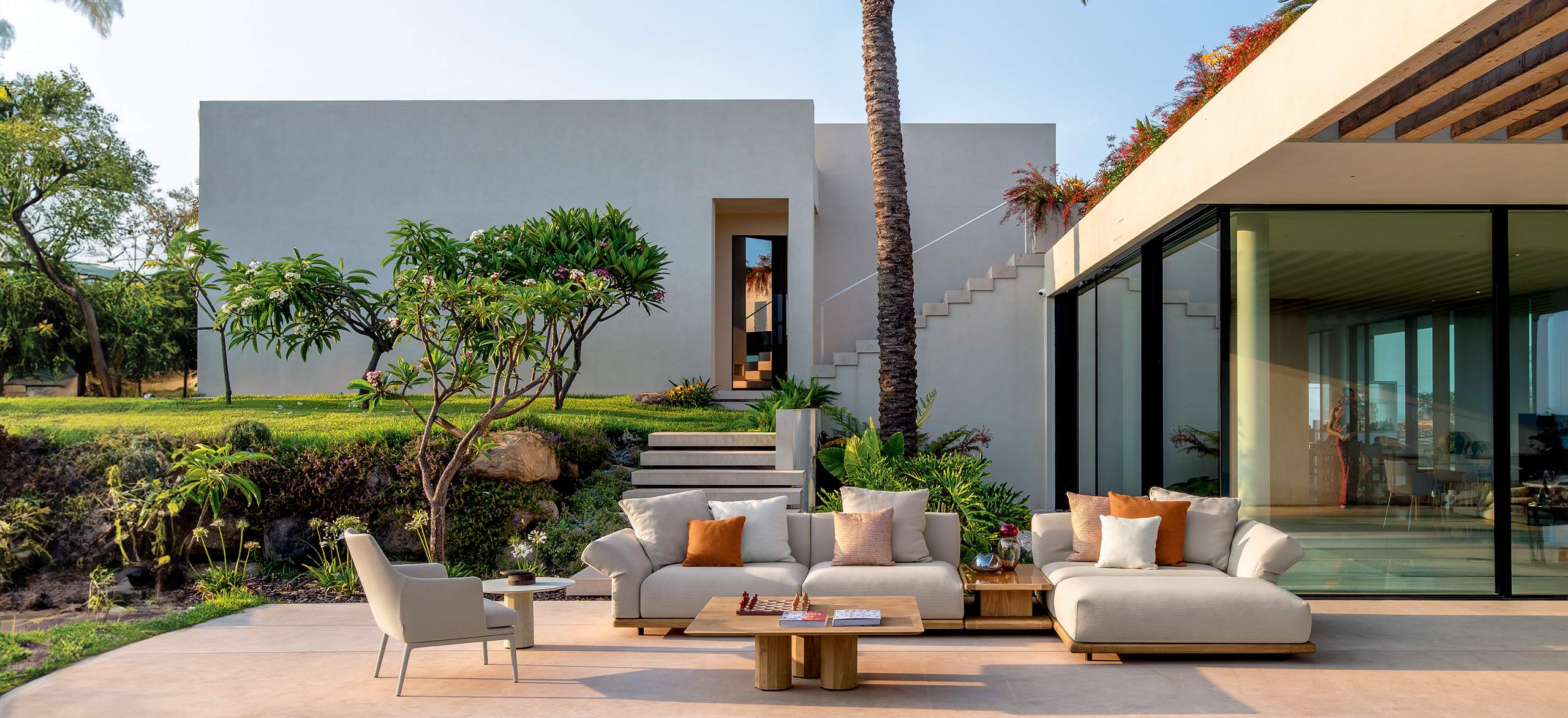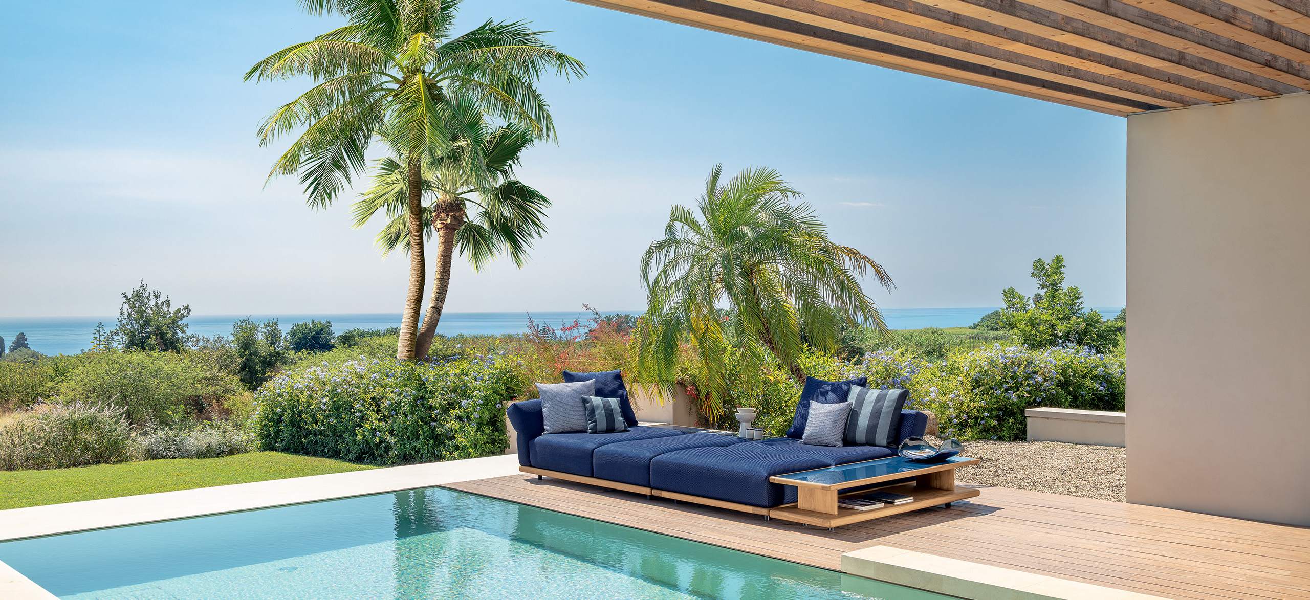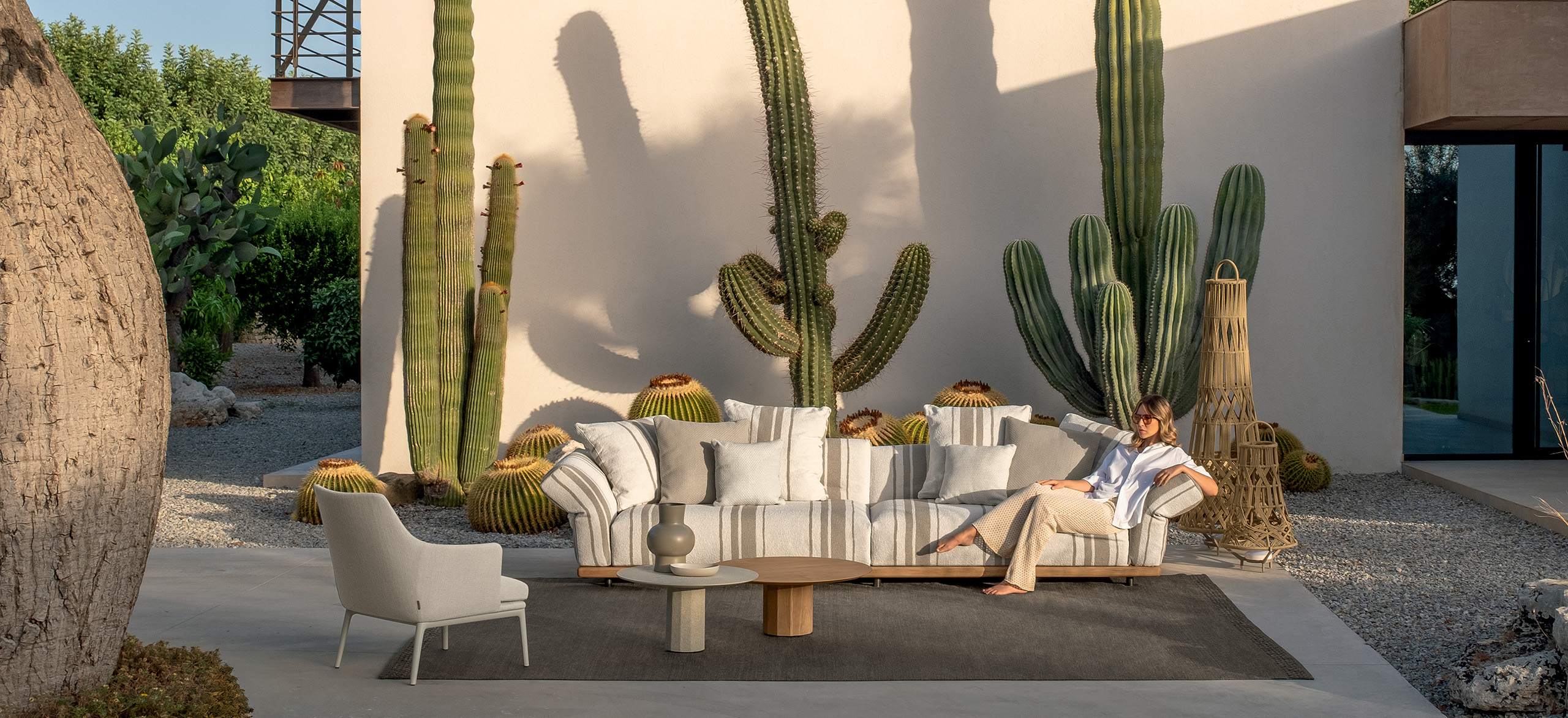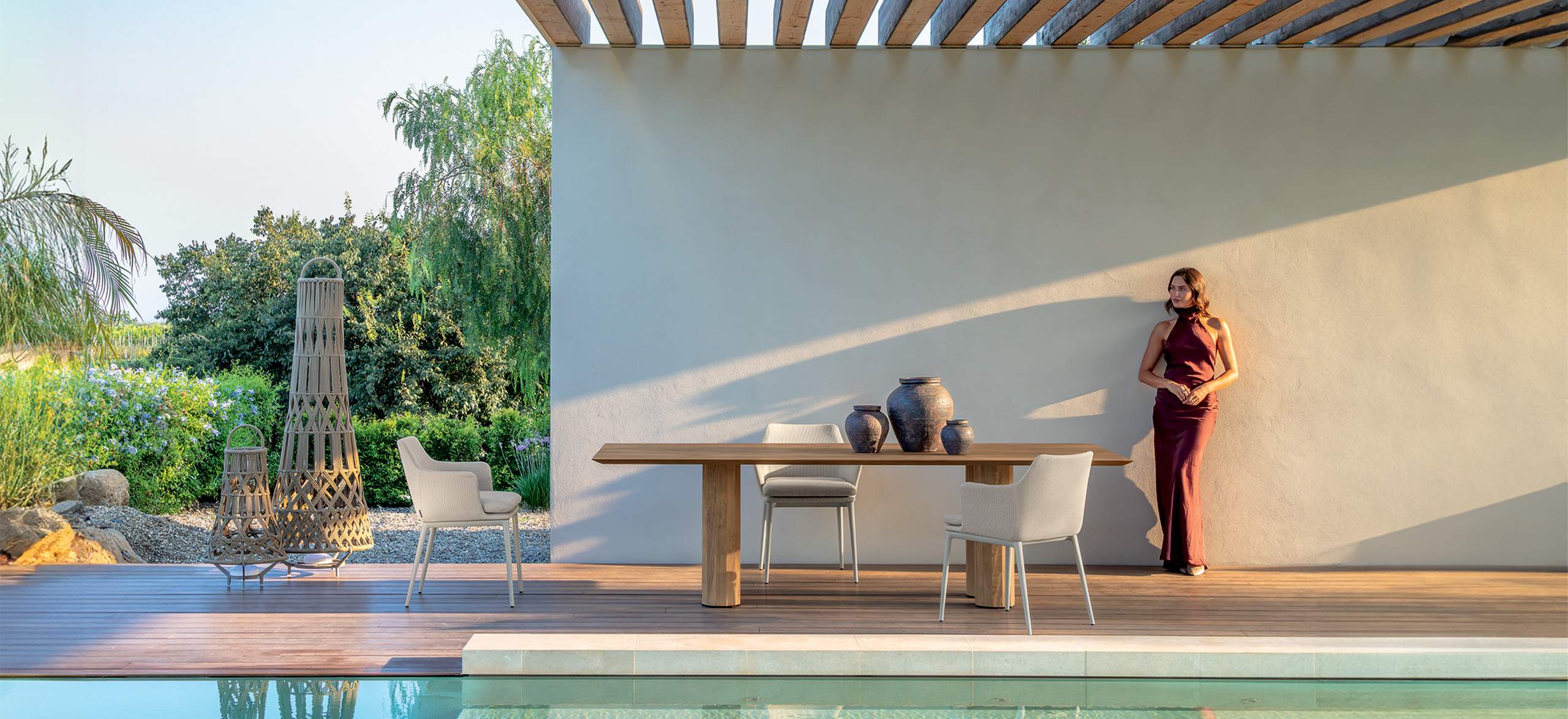 Elton est une collection qui sublime la capacité de Talenti à estomper les frontières entre intérieur et extérieur grâce au raffinement des formes et des matériaux. Une modularité sans égale introduit une nouvelle façon de vivre les espaces extérieurs : pour la première fois, les dossiers et les accoudoirs des canapés deviennent inclinables grâce à un mécanisme intégré dans la structure qui en permet le réglage. La technologie au service du design, capable de conférer au canapé une sinuosité esthétique inédite et de jouer sur la possibilité de personnaliser entièrement son confort. La collection se compose également de tables basses en bois d’Accoya, naturel ou palissandre, rehaussées d’élégants plateaux en verre émaillé.