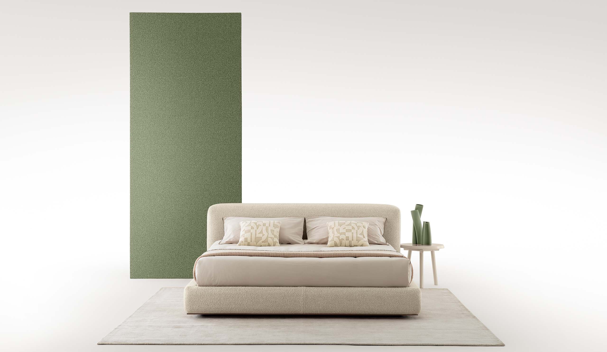 Le lit GLADYS interprète l’espace nuit avec une élégance douce et rassurante, où le confort et la qualité de fabrication s’unissent dans un projet équilibré et intemporel. La tête de lit rembourrée, large et enveloppante, repose sur une structure en bois multiplis et bois massif, garantissant solidité et durabilité. Les bandes périmétrales, également en bois multiplis, sont enrichies d’un rembourrage en polyuréthane expansé haute densité et fibre de polyester, offrant une sensation d’accueil profond. Le revêtement, disponible en tissu ou en cuir, valorise les surfaces par une riche matérialité. Le support de sommier en acier galvanisé et les pieds en aluminium moulé sous pression avec patins au sol en polymère thermoplastique complètent un lit solide et confortable, conçu pour un repos authentique.