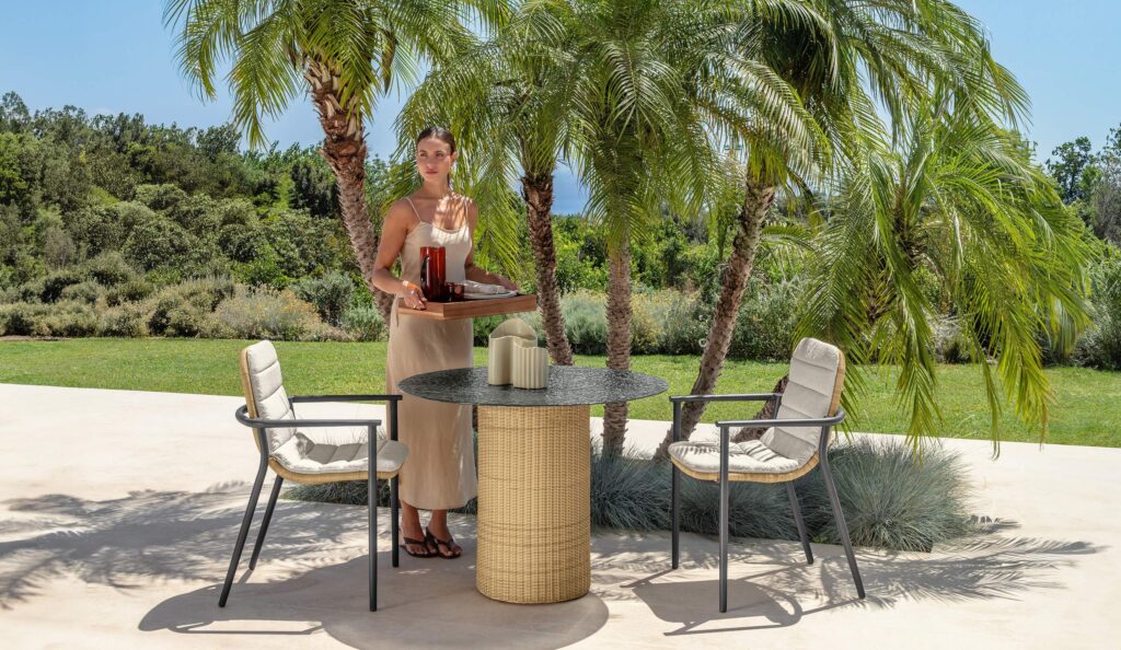 Le fauteuil de repas Bond associe légèreté visuelle et confort fonctionnel. La structure en aluminium, raffinée et essentielle, accueille un tressage en rotin qui apporte chaleur et matérialité. Le dossier ergonomique et l’assise rembourrée en tissu bouclé offrent un confort prolongé, idéal pour des moments conviviaux en plein air. Avec son design linéaire mais sophistiqué, il s’harmonise parfaitement avec les tables de la collection, créant un ensemble cohérent et élégant.
