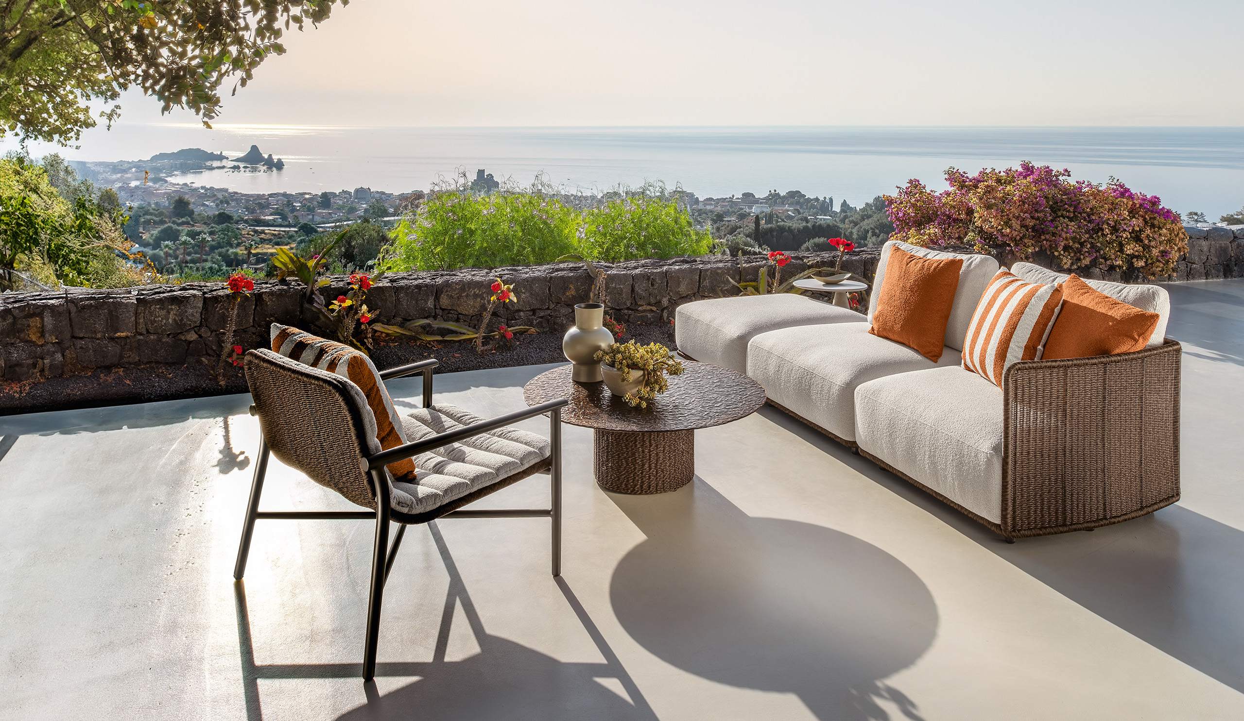 La grande table basse Bond est un élément sculptural qui enrichit l’espace avec élégance et personnalité. Le plateau en verre texturé, aux nuances allant du café au gris fumé, exprime un lien profond avec les profils de la terre, en évoquant matérialité et nuances chromatiques. Soutenue par des bases cylindriques en rotin tressé, la table associe innovation et artisanat, s’intégrant naturellement aux meubles de la collection. Sa présence discrète mais affirmée devient un point de rencontre, complétant l’espace de vie extérieur avec un équilibre raffiné entre légèreté et solidité.