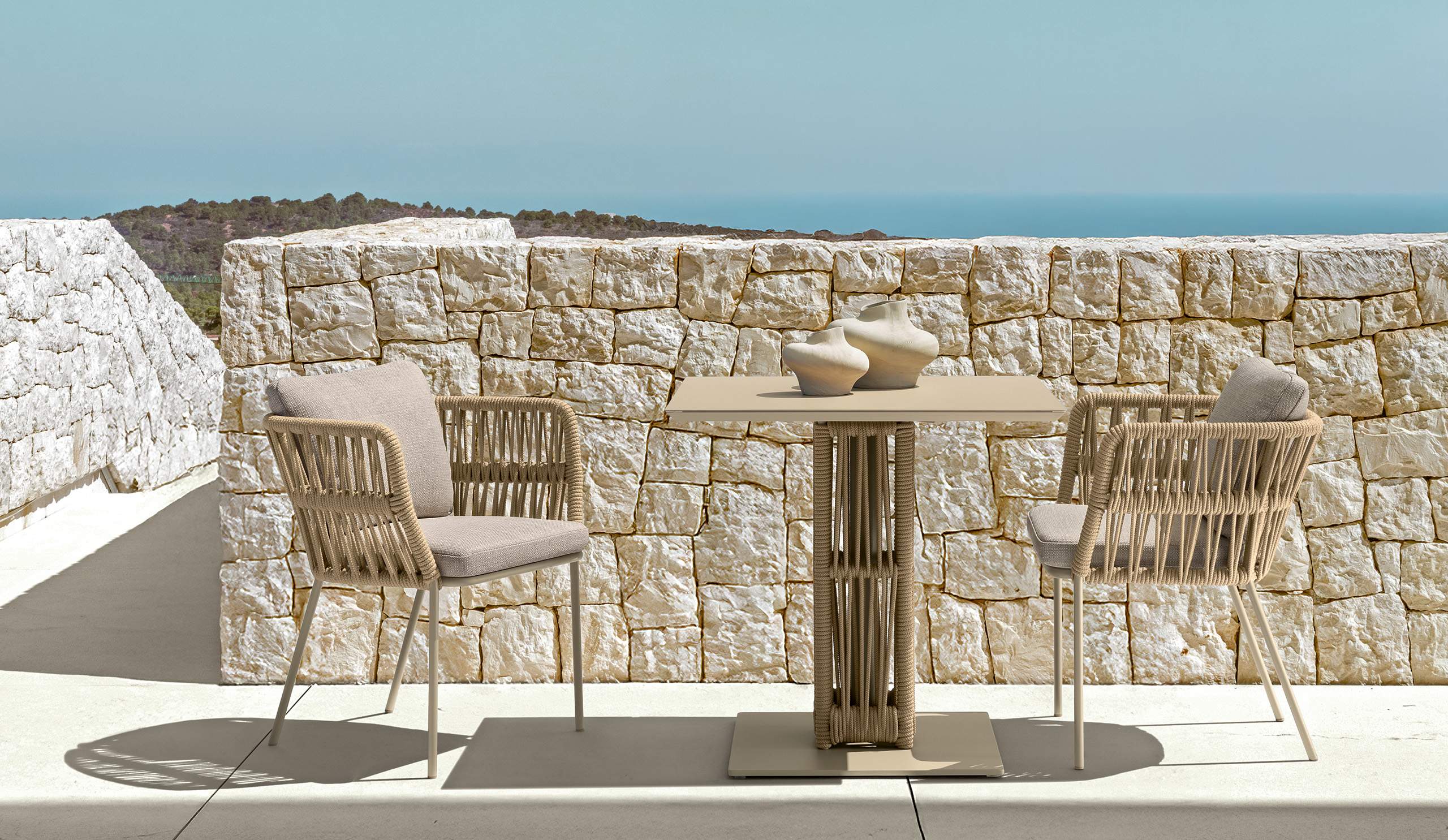 L’enchevêtrement de cordes de la collection Cliff soutient le plateau en aluminium de forme carrée 80×80. La structure en tubes métalliques est cachée par la corde qui semble soutenir le plan, rappelant le jeu de clair-obscur que l’on retrouve également dans les autres éléments de la collection Cliff. La structure est en aluminium enduit de poudre dans les couleurs Beige et Graphite, les bases des tables prévoient un entrelacement de cordes en tissu synthétique dans la même couleur que le dessus.
