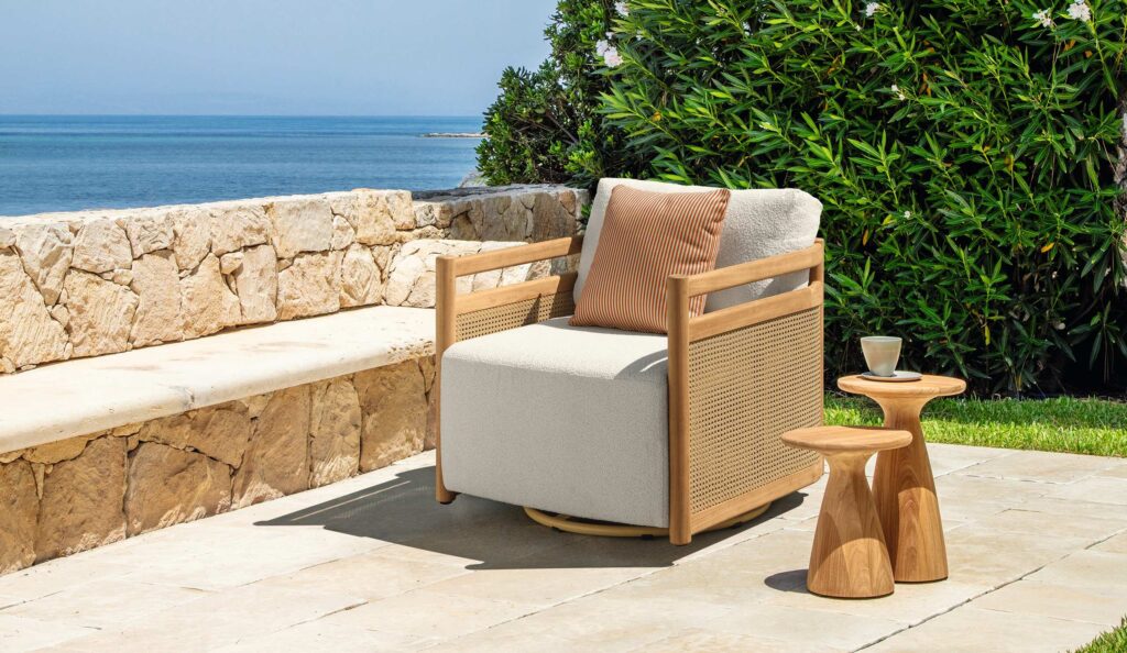 Le fauteuil living pivotant Edwin se prête à créer des zones de salon même de grandes dimensions grâce à la polyvalence avec laquelle vous pouvez profiter de son confort essentiel. En teck agrémenté d’un tressage Vienna Straw, extrêmement résistant aux agents atmosphériques, il s’adapte aussi bien aux environnements plus traditionnels qu’à ceux plus modernes et essentiels. Le tissu bouclé en blanc crème, fait du fauteuil un meuble polyvalent mais d’une grande élégance.