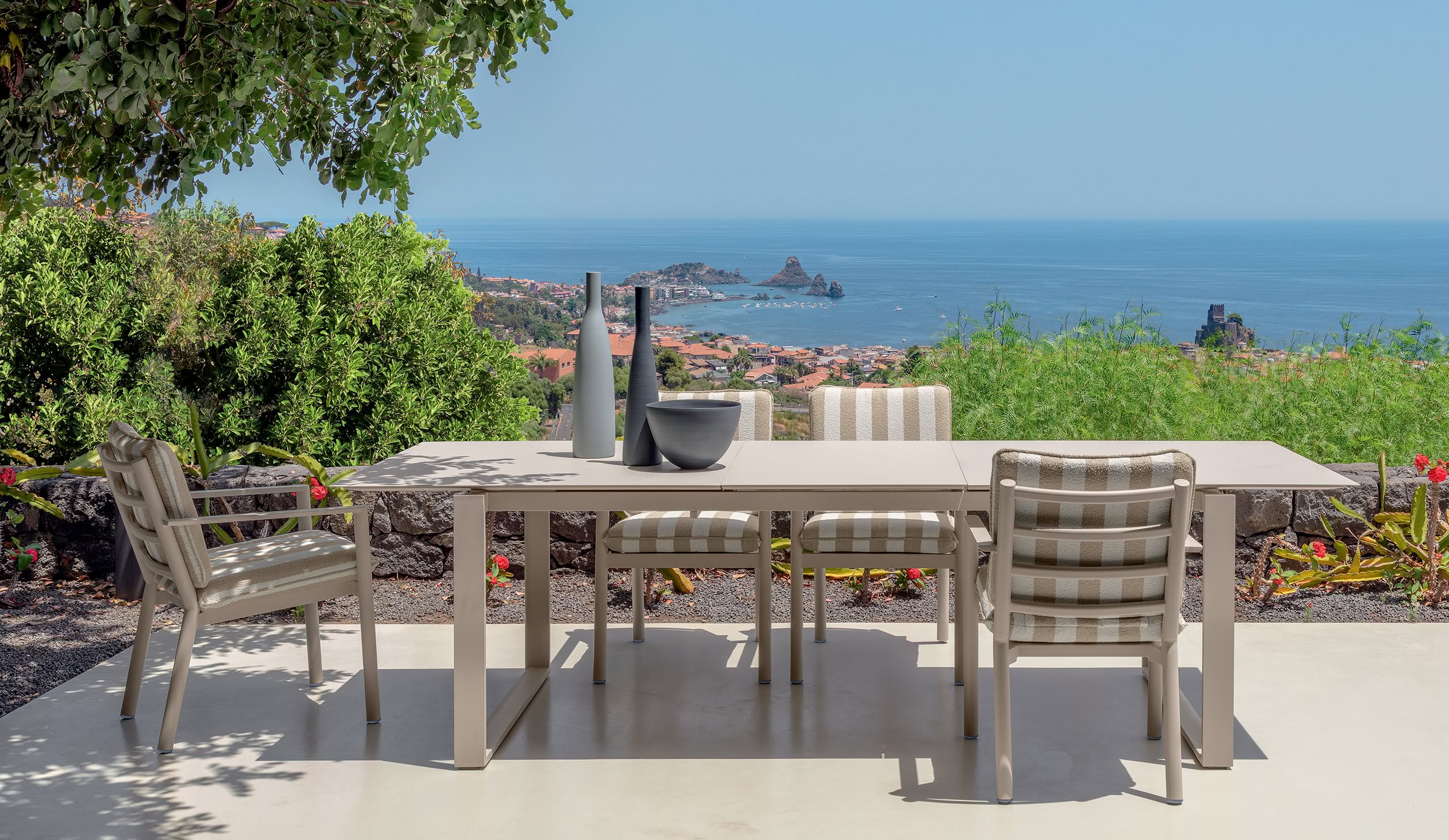 La table à manger Finn complète la collection avec une présence architecturale forte : base luge en aluminium, résistante aux intempéries et facile à entretenir.