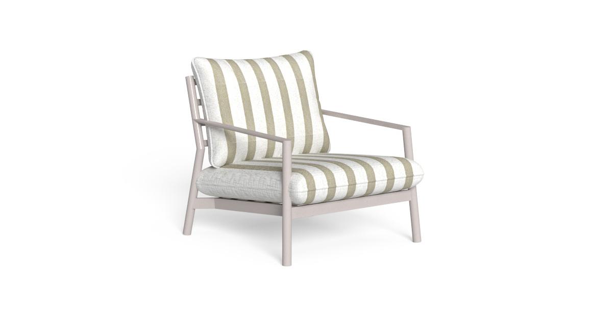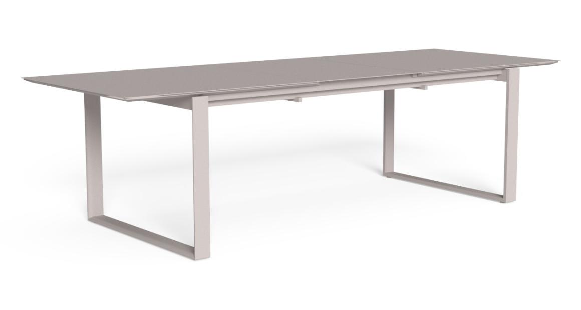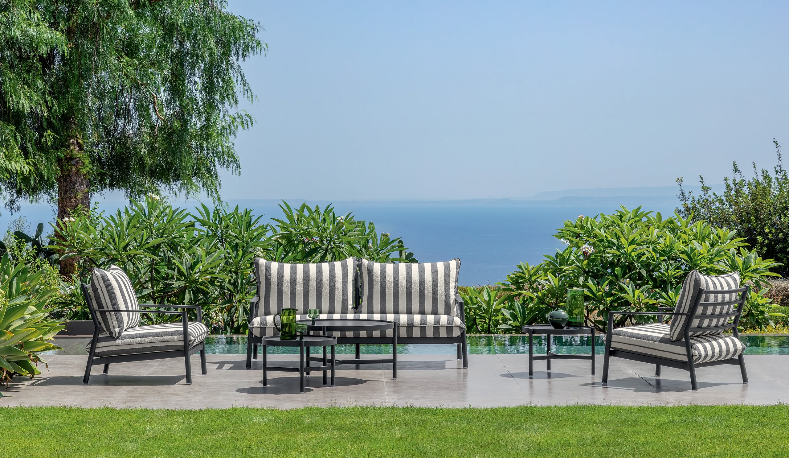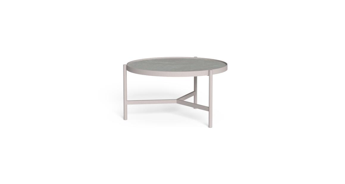 La table basse Finn complète la collection par une touche architecturale affirmée : structure en aluminium et plateau en grès cérame, résistant aux intempéries et facile à entretenir.