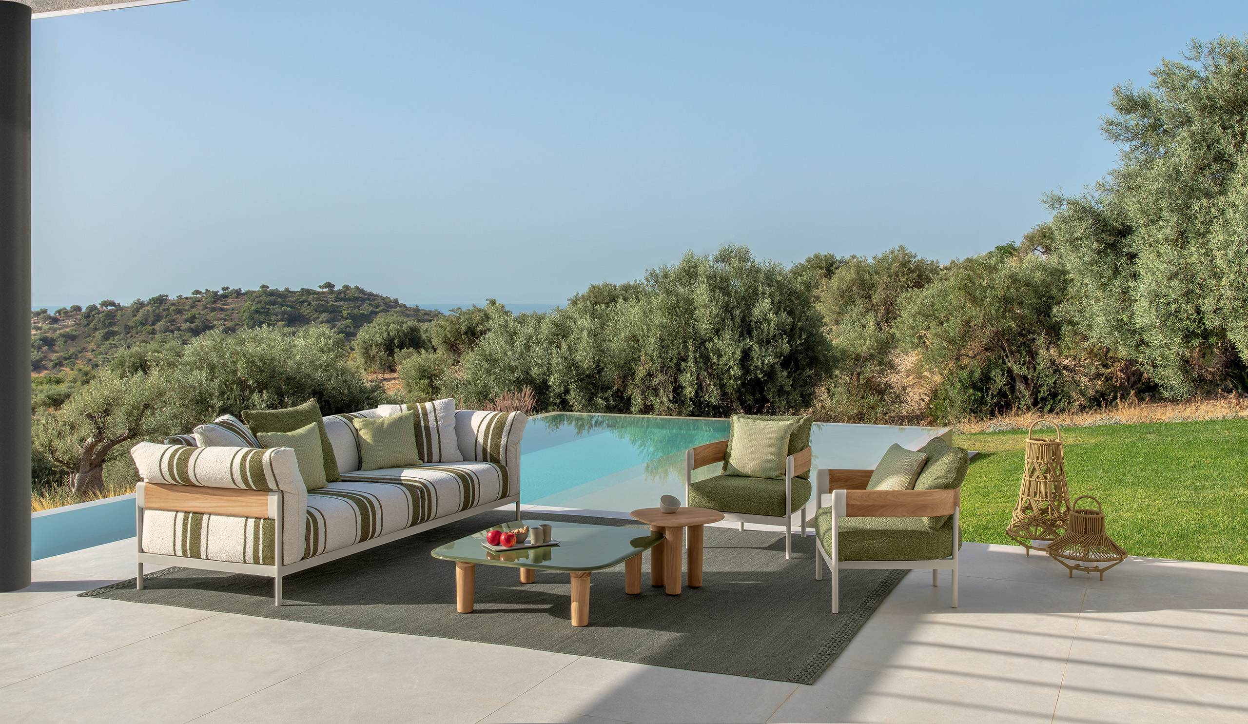 Chaleureux et spectaculaire, le canapé 3 places offre tout l’espace nécessaire pour partager des moments de détente en bonne compagnie. Ses lignes fluides et contemporaines s’unissent à la solidité de l’aluminium et à la chaleur naturelle du teck, créant un équilibre matériel d’un grand impact esthétique. Les coussins larges, habillés de tissus raffinés, procurent une sensation de confort enveloppant, tandis que les teintes de la structure ajoutent élégance et caractère à tout espace extérieur.