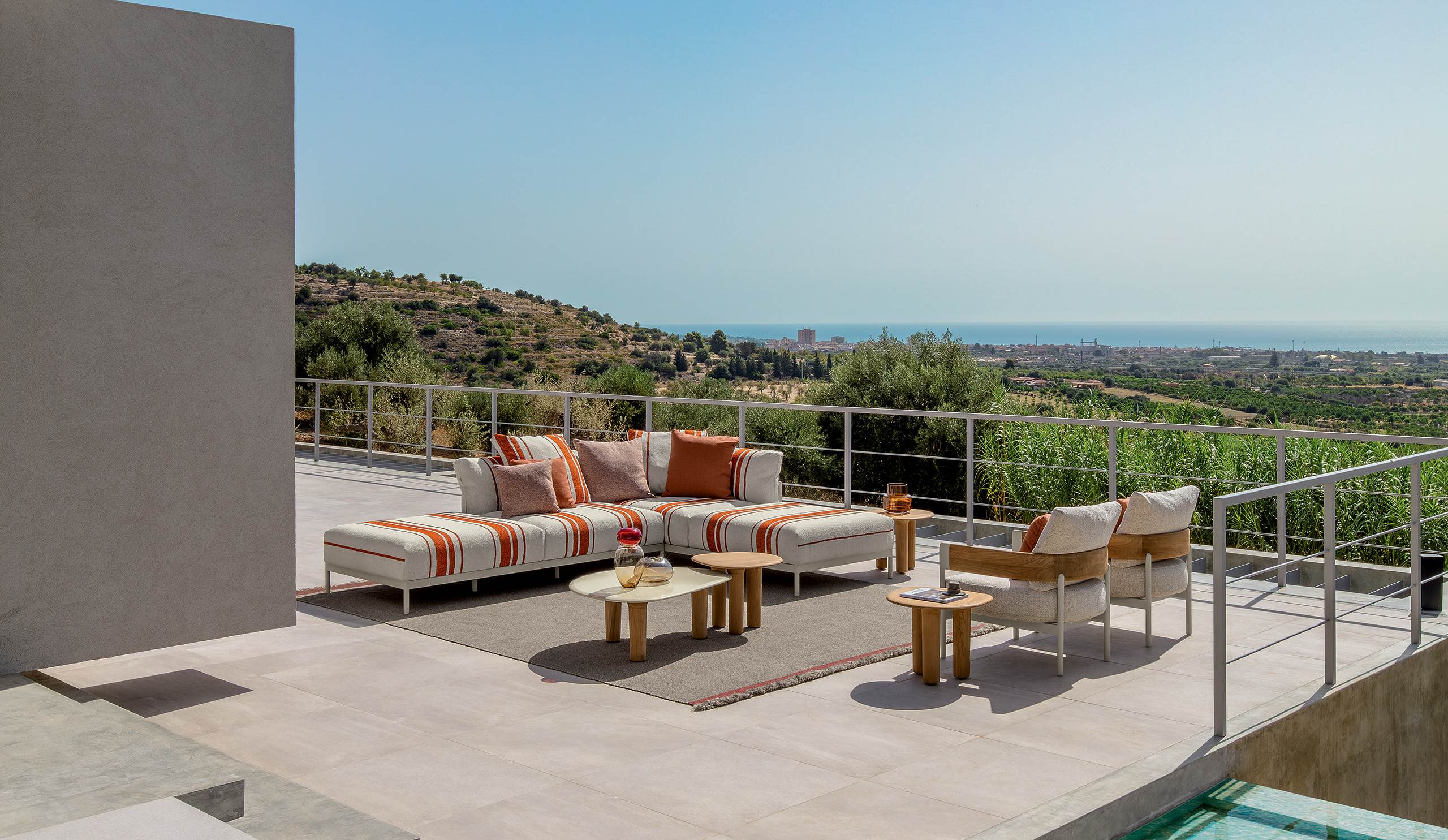 Le canapé modulaire incarne l’essence de la collection : un système flexible et polyvalent qui permet d’innombrables compositions, s’adaptant avec élégance naturelle aux espaces vastes ou intimes. Sa structure en aluminium, proposée dans des finitions raffinées blanc chaud ou moka, dialogue harmonieusement avec le teck et les tissus rayés à forte valeur décorative. De généreux coussins enveloppants amplifient le confort, transformant le salon extérieur en oasis personnalisée de bien-être.