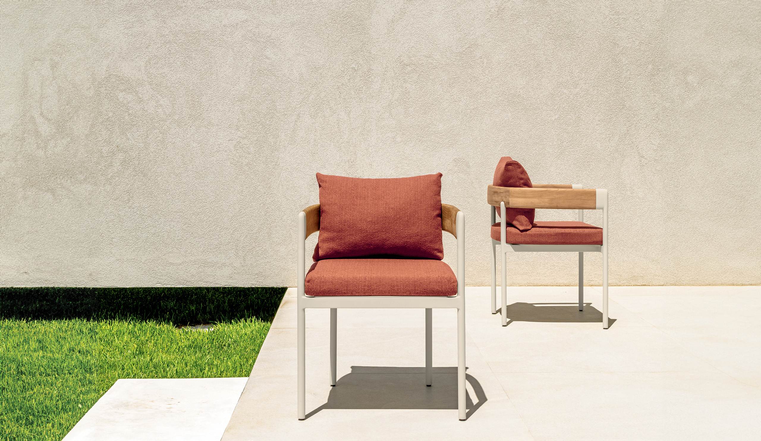 Les chaises de repas complètent avec équilibre et style la proposition dining de la collection. Leurs lignes légères et contemporaines s’unissent à des matériaux raffinés tels que l’aluminium et le teck, créant un mobilier élégant et résistant aux défis de l’extérieur. Habillées de tissus disponibles en variantes décoratives et élégantes, elles offrent confort et personnalité à chaque table. Fonctionnelles et décoratives à la fois, elles s’intègrent parfaitement aux tables de la collection.