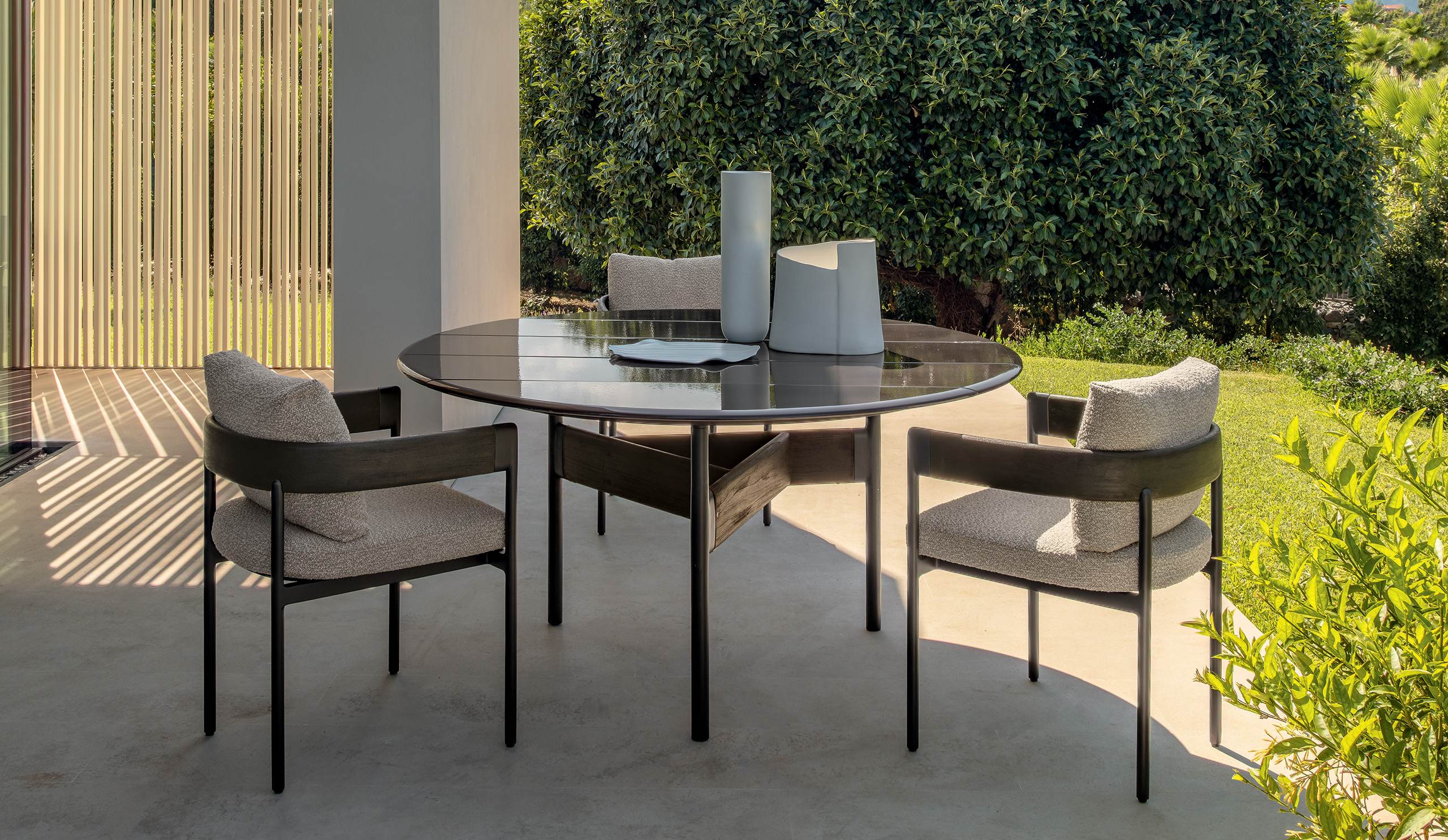 La table de repas D150 incarne l’esprit de convivialité et de partage propre aux espaces extérieurs. Ses lignes harmonieuses et équilibrées se déploient autour d’une structure en aluminium solide et élégante, enrichie de détails en teck soulignant son raffinement naturel. Pensée pour accueillir déjeuners, dîners et rencontres, elle associe la chaleur du bois à la force esthétique du grès émaillé en blanc lait ou vert olive, apportant à l’extérieur l’élégance de l’intérieur.