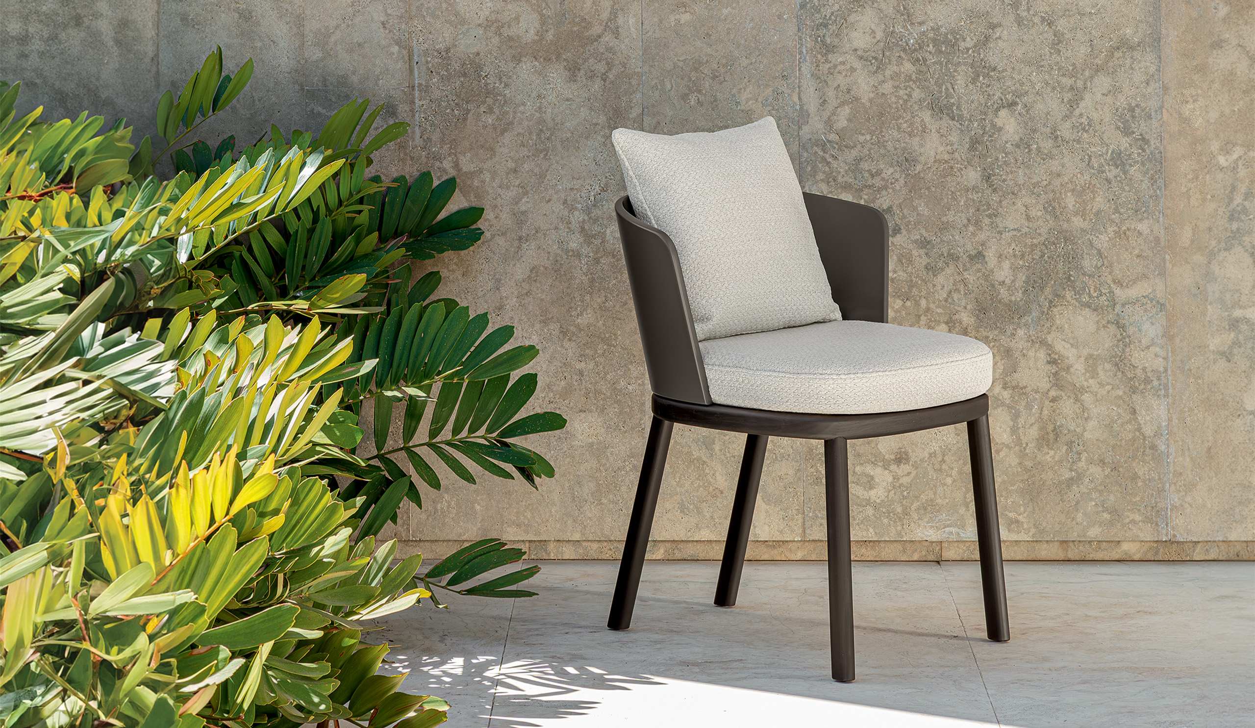 La chaise de salle à manger Itaca, se développe sur un socle en Accoya®, dans les coloris teck naturel ou palissandre, qui suit, en fluidité totale, le dossier incurvé qui reprend les lignes du fauteuil living, rendant l’assise particulièrement accueillante. Les tissus s’associent, en continuité avec la palette du set living, aux couleurs des dossiers, offrant un large éventail de possibilités.