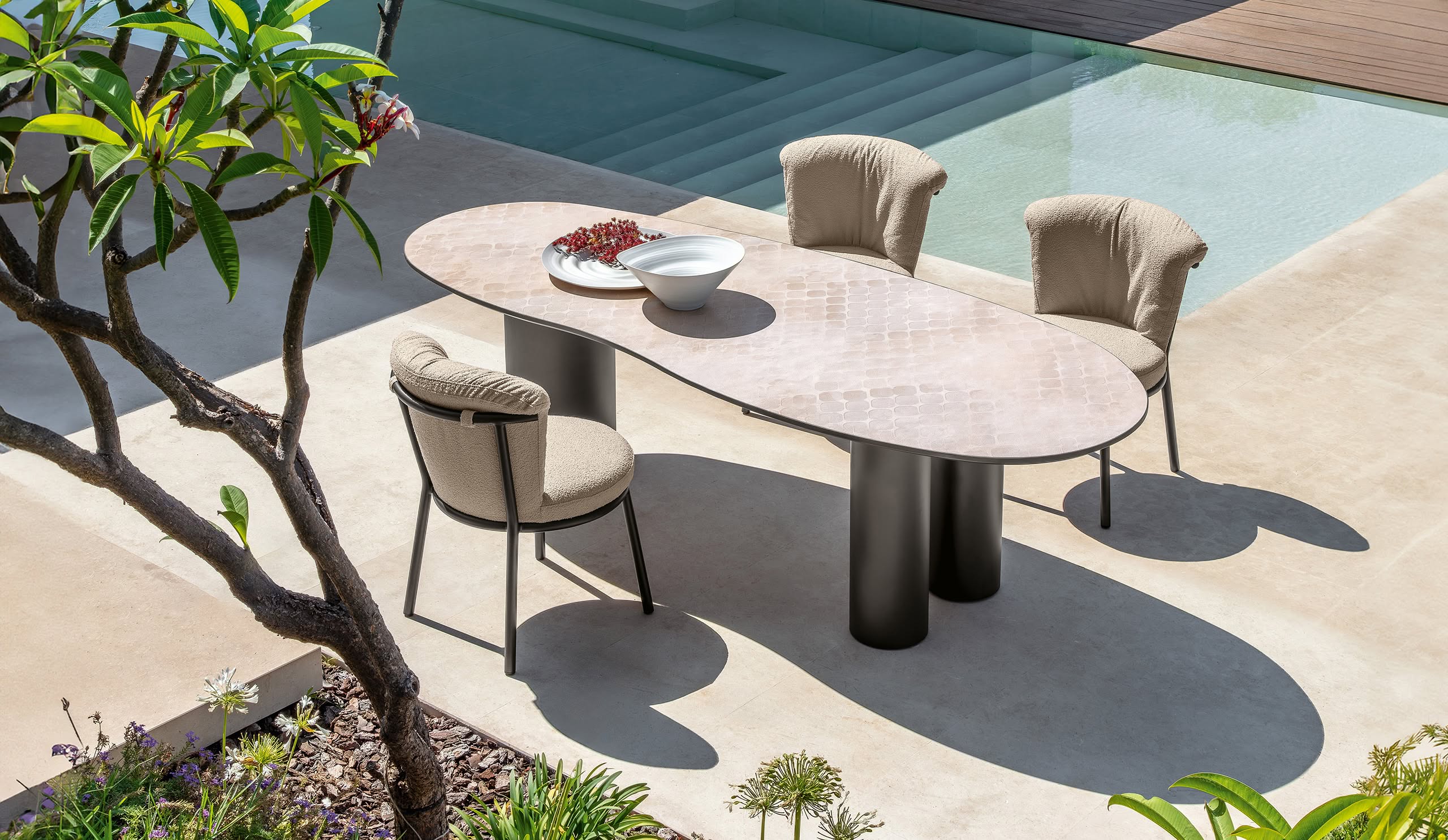 La structure en aluminium peint s’accorde à la surface texturée du plateau pour donner vie à un ensemble raffiné et contemporain, parfait pour tout espace extérieur ou intérieur.