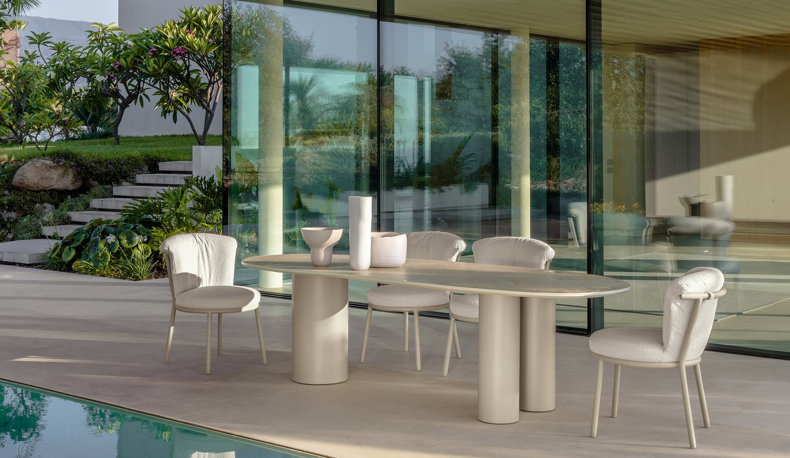 La structure en aluminium peint s’accorde à la surface texturée du plateau pour donner vie à un ensemble raffiné et contemporain, parfait pour tout espace extérieur ou intérieur.