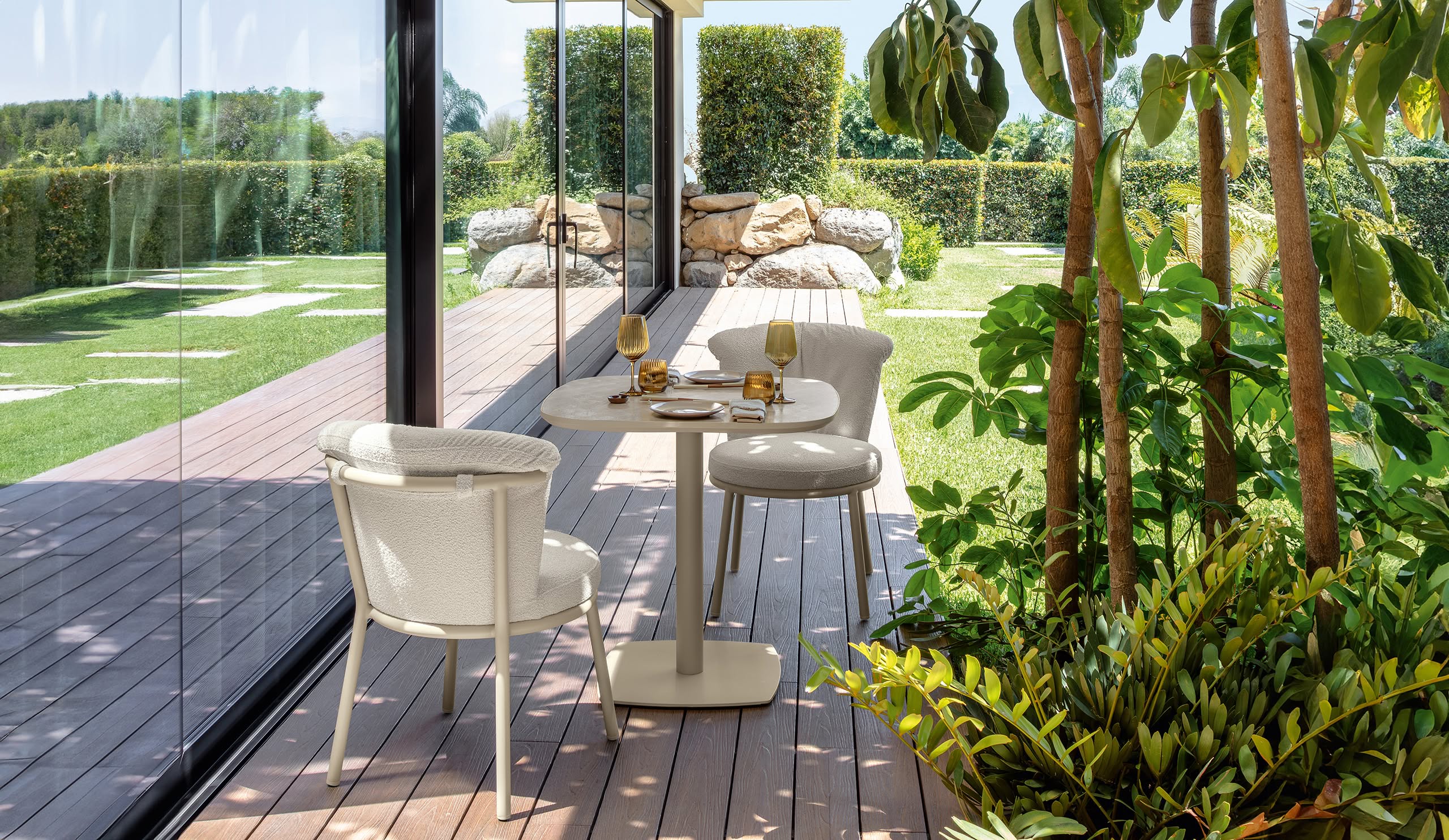 La structure en aluminium peint s’accorde à la surface du plateau, donnant naissance à un ensemble raffiné et contemporain qui valorise chaque espace, intérieur ou extérieur.